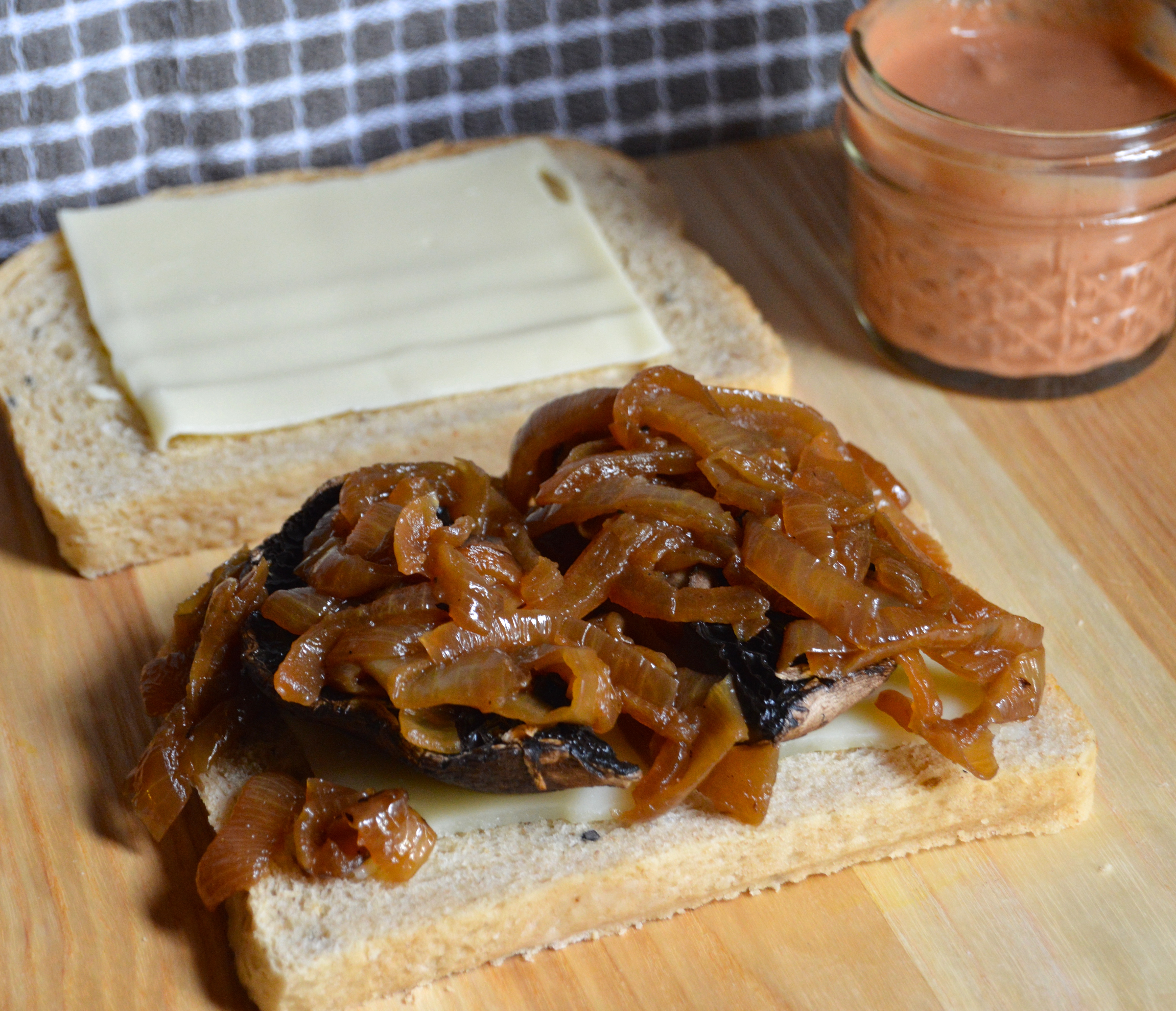 Portobello Patty Melts Serves: 4 Start to Finish: 45 min Ingredients For Caramelized Onions & Roasted Portobellos 1/2 TBS Butter 1/2 TBS Olive Oil 2 Yellow Onions (mine totaled 1.8 lbs) Salt 4 Portobello Mushroom Caps Garlic Powder Black Pepper For Special Sauce 1/4 cup Organic Ketchup 2 TBS low fat Plain Greek Yogurt 1 TBS Mayo 2 TBS finely chopped Dill Pickle 2 TBS grated Onion For Sandwich Assembly 8 slices organic Rye Bread (I used Rudi's) 4 slices Swiss Cheese 4 slices quality American Cheese (or cheddar) 100% Olive Oil or Canola Oil Spray (non-aerosol can)
