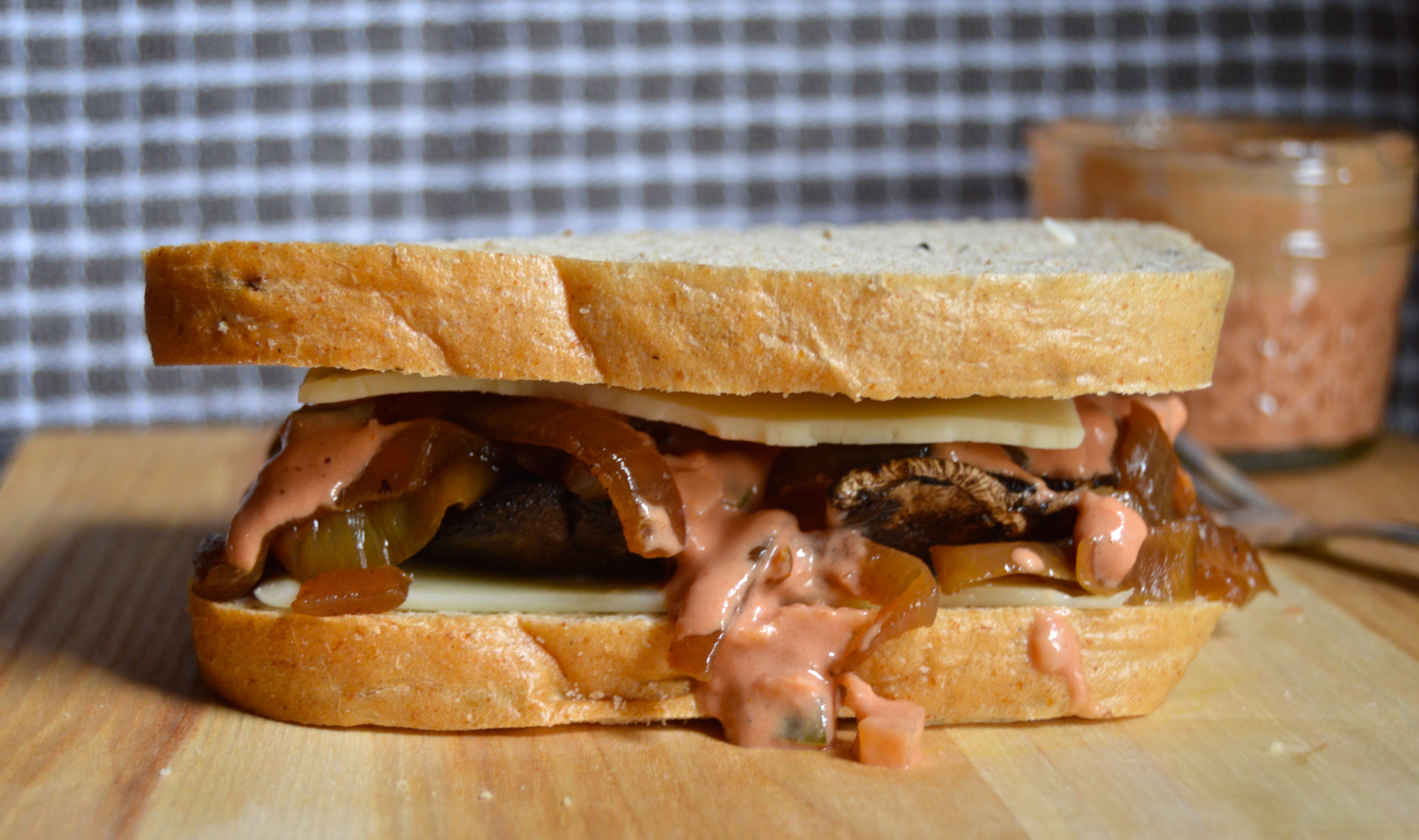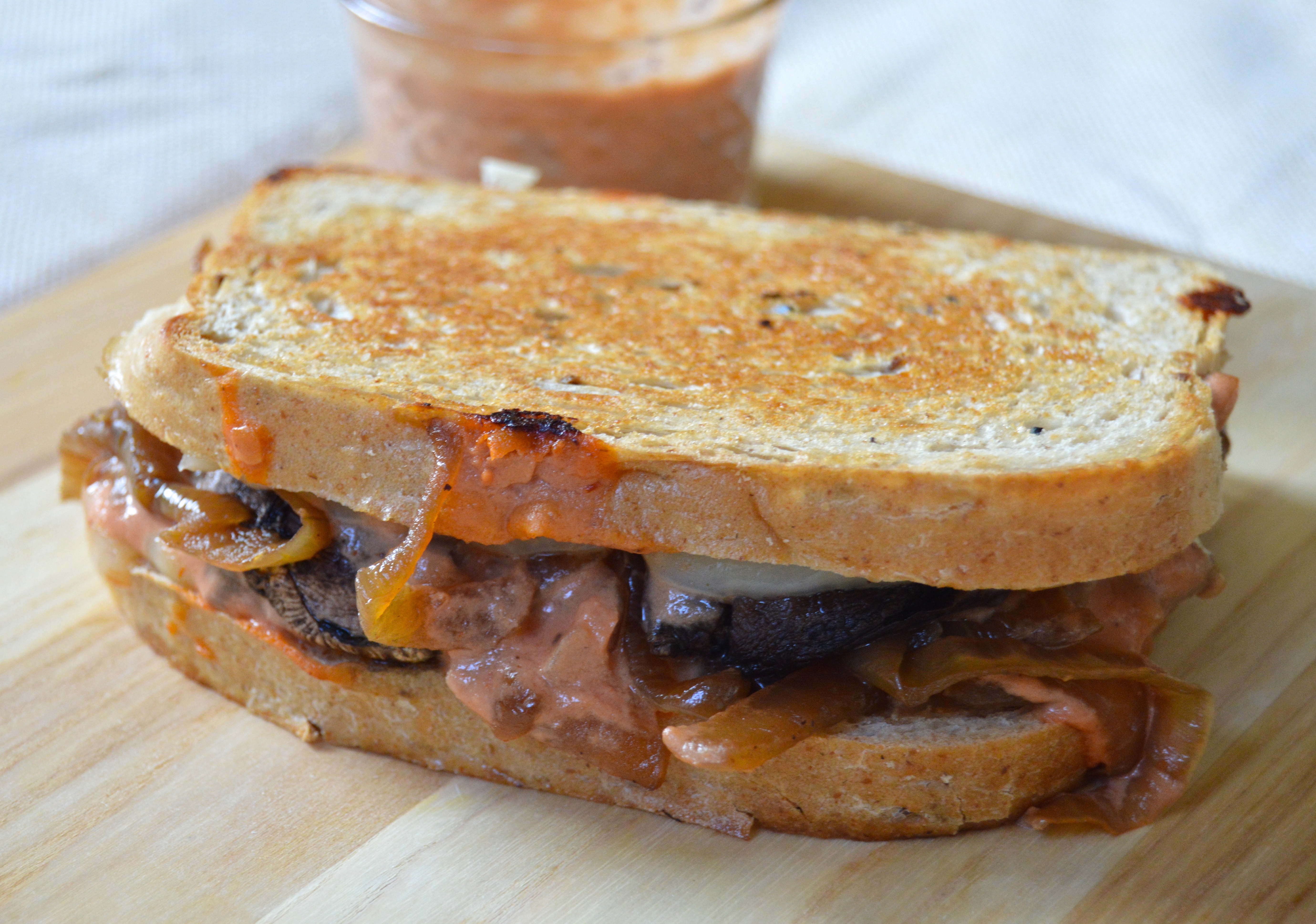 Oh man, what a busy week it has been. Parents in town visiting me and my sister in NYC and unexpected dramas have kept me from cooking (and blogging). Not that I’m complaining. One of the best parts about mom and dad in town is the food; my mom’s cooking, trying new restaurants, and visiting old favorites too. But now it’s calming down and I can get back in the kitchen. Which brings me to last night’s dinner, a total winner if I do say so myself. These vegetarian-friendly patty melts have most of the elements of a traditional American diner patty melt; griddled rye bread encasing sweet caramelized onions, two kinds of melty cheese, and homemade “secret sauce”. The only difference is that I subbed roasted mushroom caps for the traditional hamburger patty. Such a simple swap and voila, I’m able to enjoy a classic American sandwich while sticking to my meat-free diet. Phenomenal.