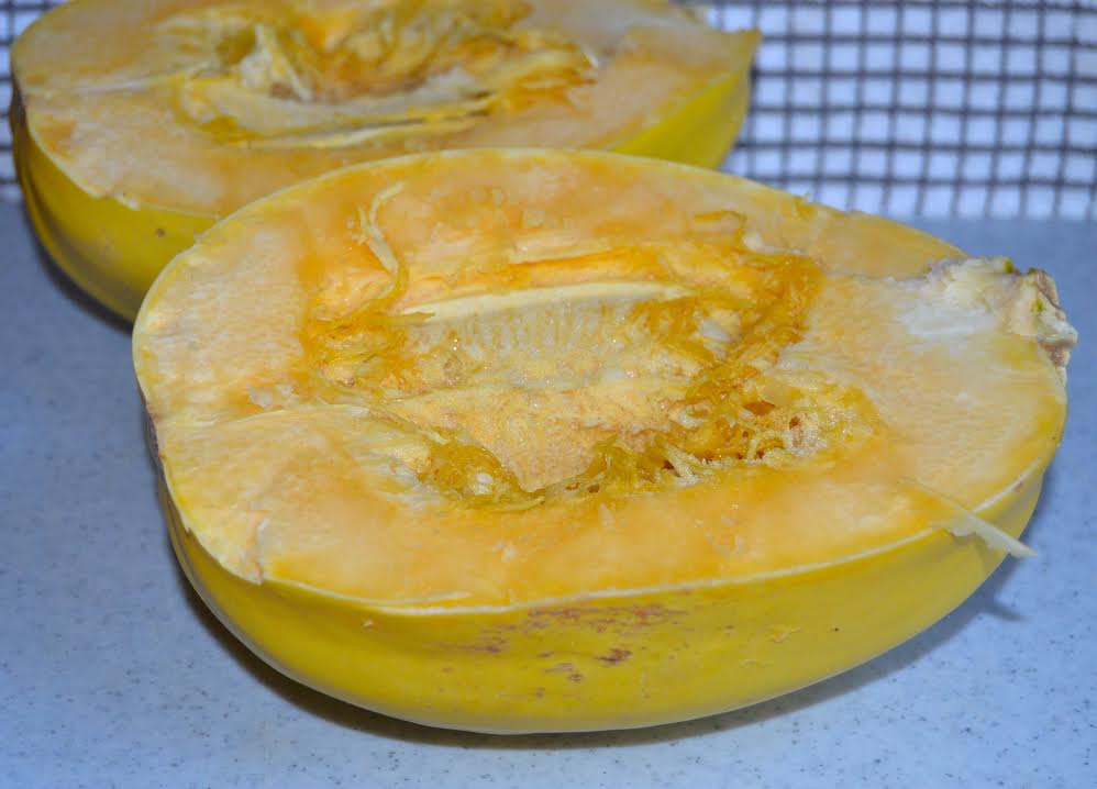 Cut spaghetti squash length-wise. Be very careful! Scoop out seeds and pulp from the center of each half. Rub the cut side of each half with 1/2 teaspoon olive oil or canola oil. Season each cut side with 1/4 teaspoon salt and pepper to taste. I used 2 pinches of pepper per half.