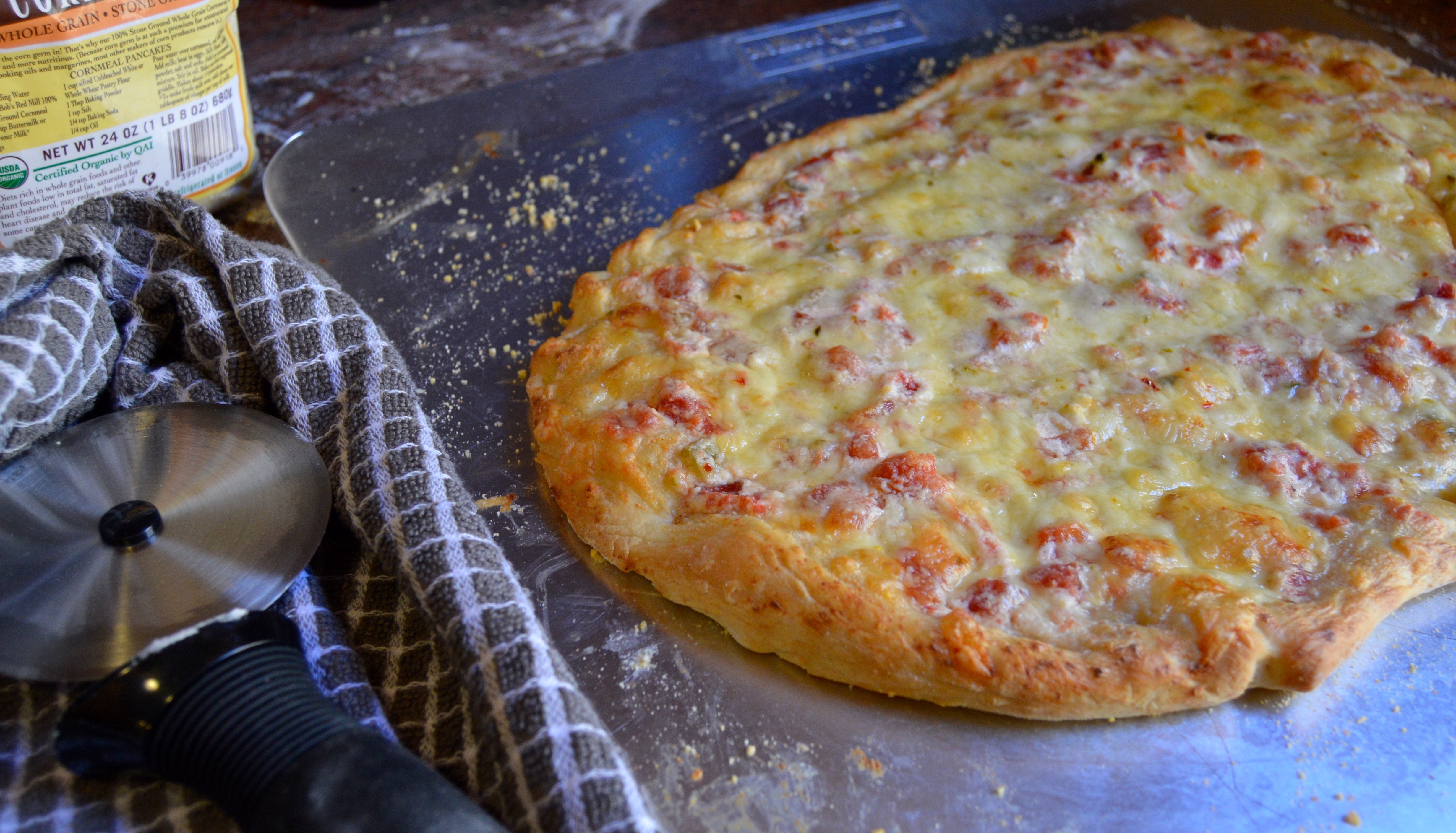 Transfer dough discs to a preheated sheet pan or pizza peel that’s been dusted with cornmeal.*** Cover pizza dough with desired toppings, leaving a thin edge of crust around the outside untouched. Bake for 8-10 minutes in a preheated 500 degree oven until crust edges are golden brown and center crust is cooked through.