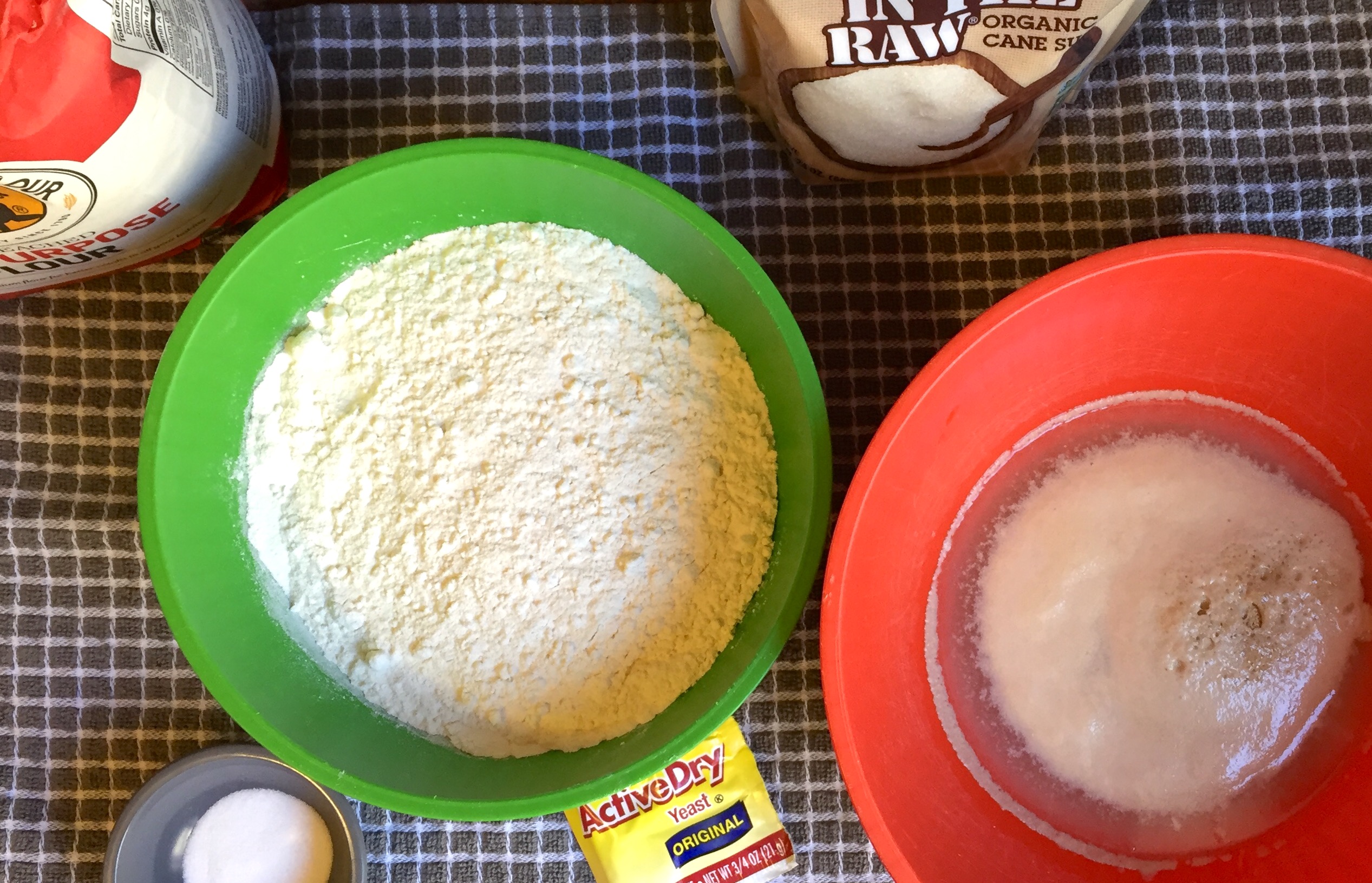 Mix flour and salt together. Add flour/salt mixture and 1 tablespoon olive oil to yeast. Mix with a fork or spoon to combine. On a clean counter or other surface dusted with flour, knead the dough for about 8-10 minutes until all ingredients are incorporated into a smooth ball of dough. If the dough is too sticky add more flour, a couple tablespoons at a time.** Sometimes it requires up to 1/2 cup more flour and you could be adding flour for most of the kneading time.