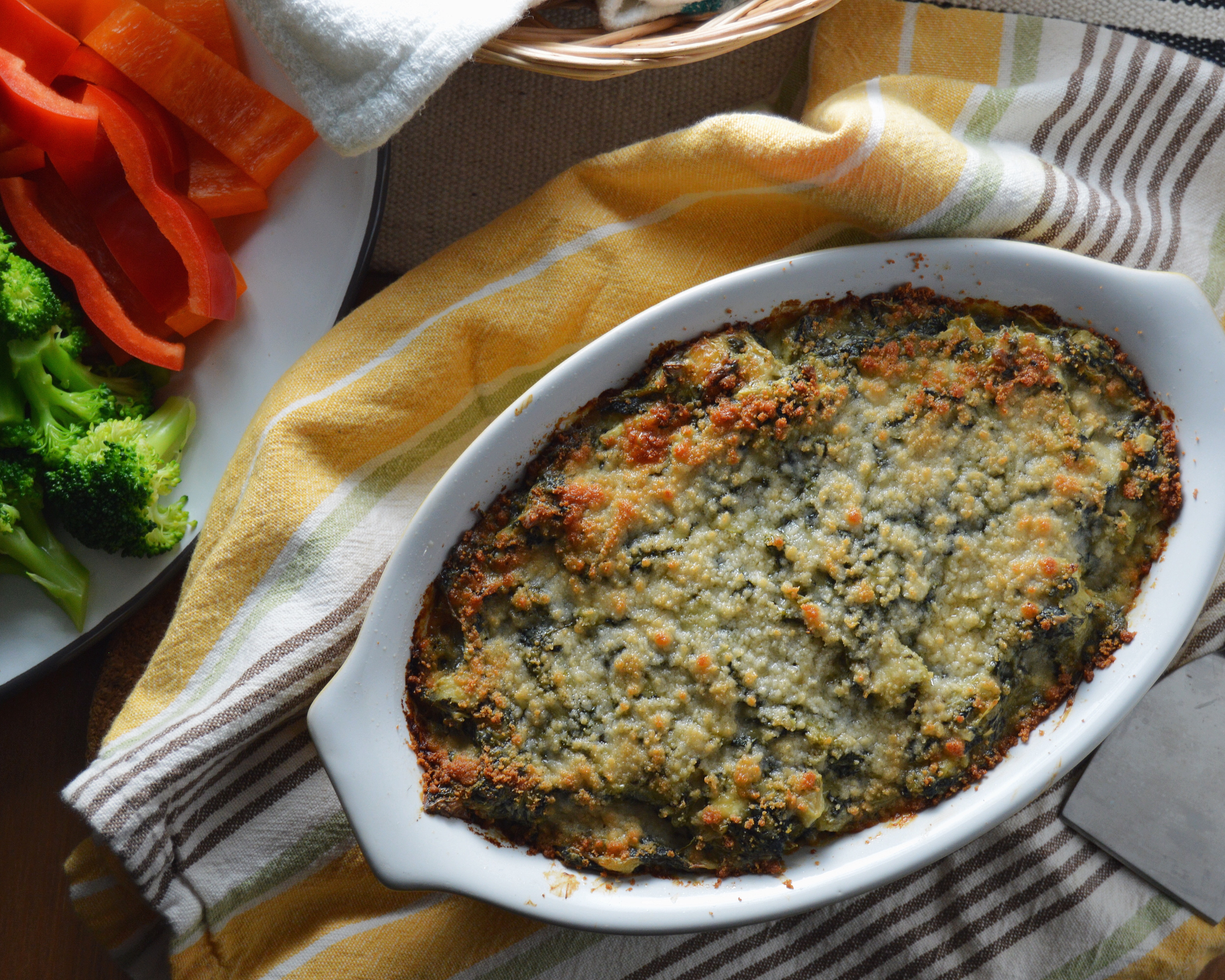 Spinach-artichoke dip is pretty much everyone’s favorite. I may be exaggerating a little bit there, but seriously, it’s so unbelievably good. For my catering event this week, this classic dip was on the appetizer list, so I experimented a bit beforehand to come up with the best version. It’s not light, and it’s not what I’d consider “healthy,” but it’s deliciously indulgent, irresistibly creamy and made with whole ingredients… and in my opinion, that’s worth splurging for. Side note, if you want to lighten it up a bit, I’ve included a few swaps in the recipe.