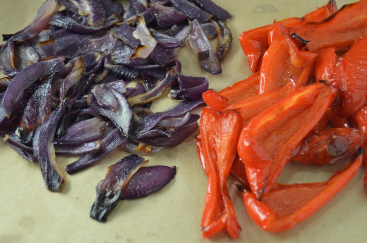 Toss onion slices with 2 tsps olive oil and a big pinch salt. Spread out in an even layer on a lined baking sheet. Toss bell peppers with 2 tsps olive oil and a big pinch salt. Spread out onto an even later on a lined baking sheet. One full-size sheet pan should work for onions and peppers together. Roast in preheated oven for 20 minutes. Toss, keeping the onions and peppers separate. Return to oven and continue roasting until beginning to char – 10-15 min for onions, 15-20 minutes for peppers.