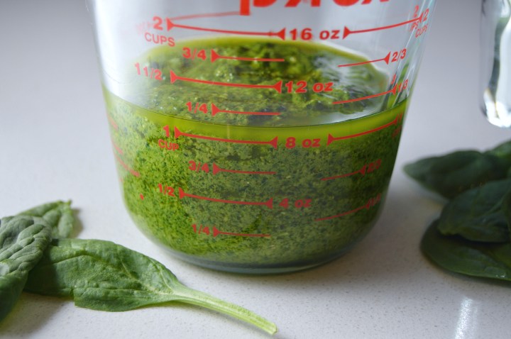 So why would I replace some of the basil in classic pesto with spinach? Like, why would someone do that? Isn’t basil good enough? Listen, I love basil, it holds a special place in my heart. But here’s the thing, buying enough basil to make a sufficient amount of pesto can get pricy. Adding baby spinach to the mix cuts down on that cost. And maybe you have an herb garden, so cost isn’t an issue, but making a big batch of basil pesto will pretty much wipe out your supply. Adding baby spinach saves some of your precious homegrown basil for other uses. And maybe neither of these is an issue, but a pure basil pesto is just too much basil flavor. Again, baby spinach saves the day. And if none of these are issues for you, you should still give spinach & basil pesto a try if only because it’s totally delish!