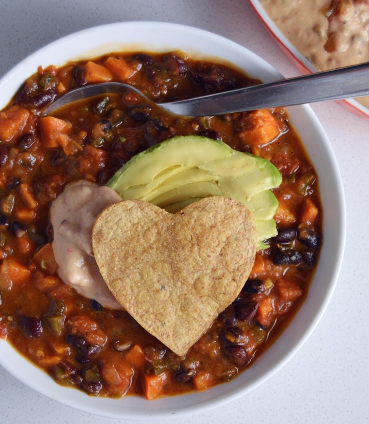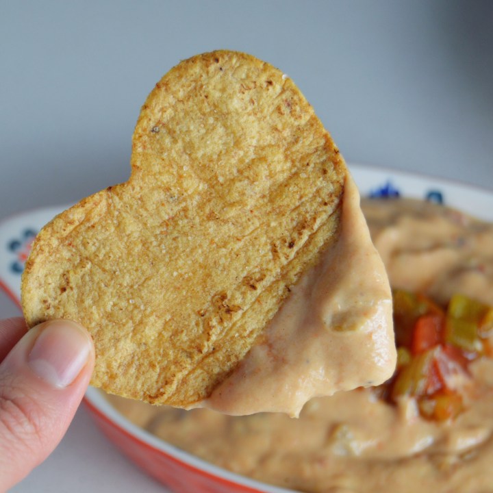 For me, Valentine’s Day is not so much about romance, bling, red roses and fancy dinners. But I still love Valentine’s Day because it’s a fun winter holiday and a good excuse to spend quality time with loved ones. If you’re on my same page, a delicious, cozy and intimate homemade dinner is just what Cupid ordered. And that’s why I’ve come up with this Valentine’s Day dinner plan. Warm and comforting vegan chili topped with my amazing cashew queso sauce and the cutest heart-shaped tortilla dippers (plus any other toppings you and your loved ones crave).