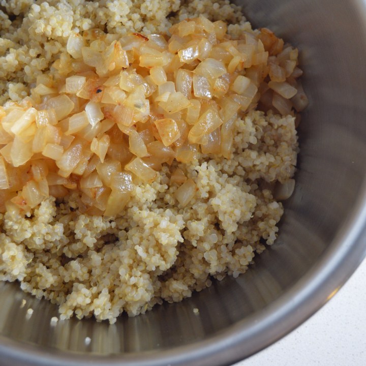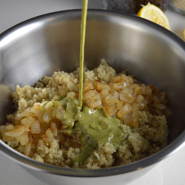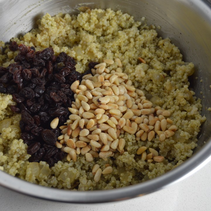 When all components are ready, mix sautéed onion into quinoa. Add lemon-mint vinaigrette, toss to combine. Add pine nuts & raisins (saving some for garnish, if desired. Toss to fully combine.