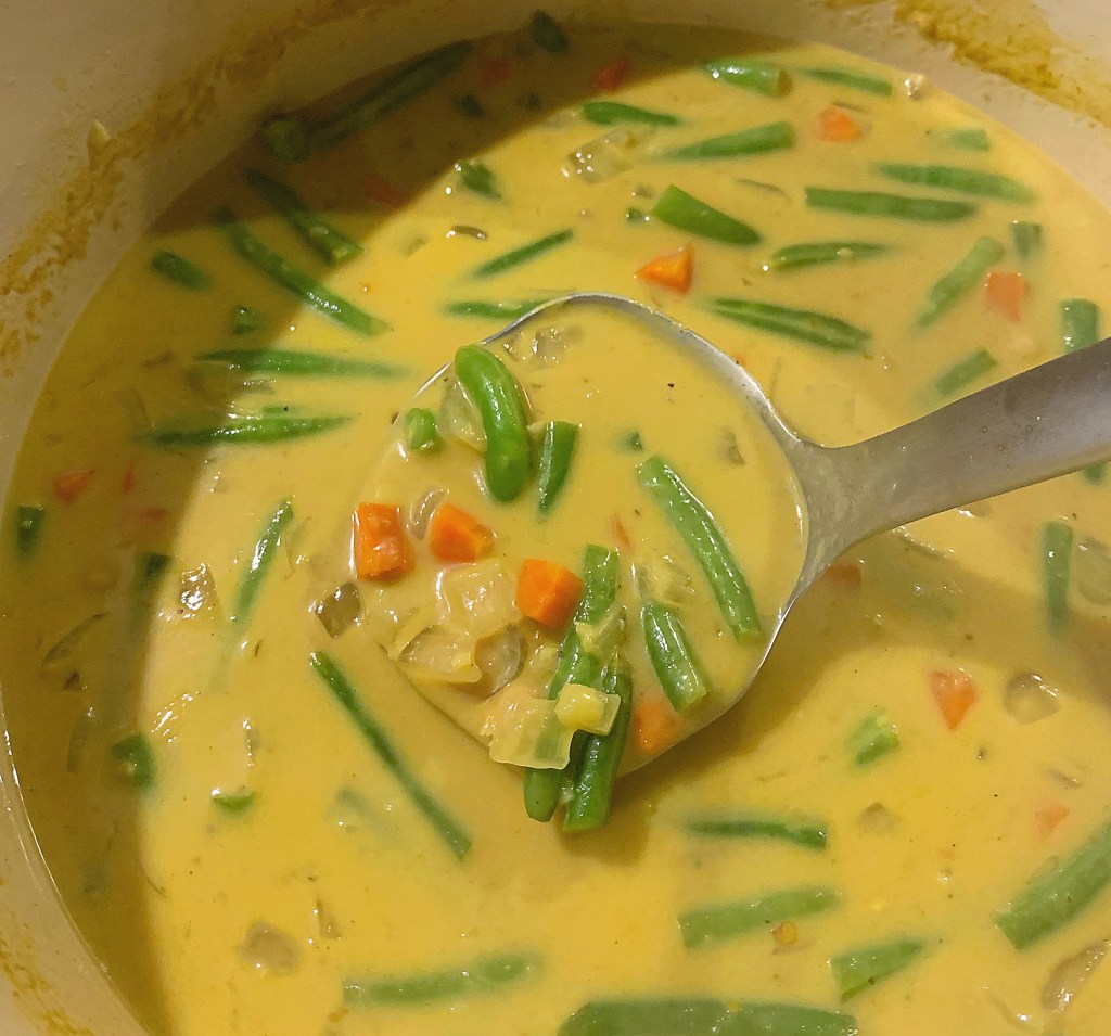 Add vegetable stock and coconut milk. Season with salt. Bring to a rolling simmer and reduce to low heat. Partially cover and simmer for 20-30 minutes.