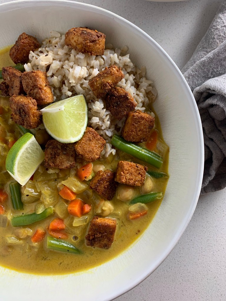 After the spices comes veggie broth and coconut milk, then just simmer for 20-30 minutes. Finally, add a can of chickpeas, fresh green beans (or any veg) and a squeeze of lime, continuing to simmer until green beans are cooked to al dente. So easy, right? And trust me when I say, it’s just as delicious as it is easy. Serve with grain of choice, maybe some cumin-roasted tofu, and any other toppings you love (scallions? pickled red onions? cilantro?).