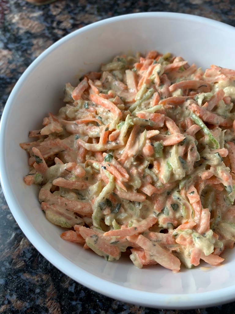To make the slaw, combine the shredded carrots & celery with 1/2 cup of the ranch dressing. Add more dressing if needed. The slaw gets better if it’s able to sit in the fridge for a bit so this is an easy make-ahead step.