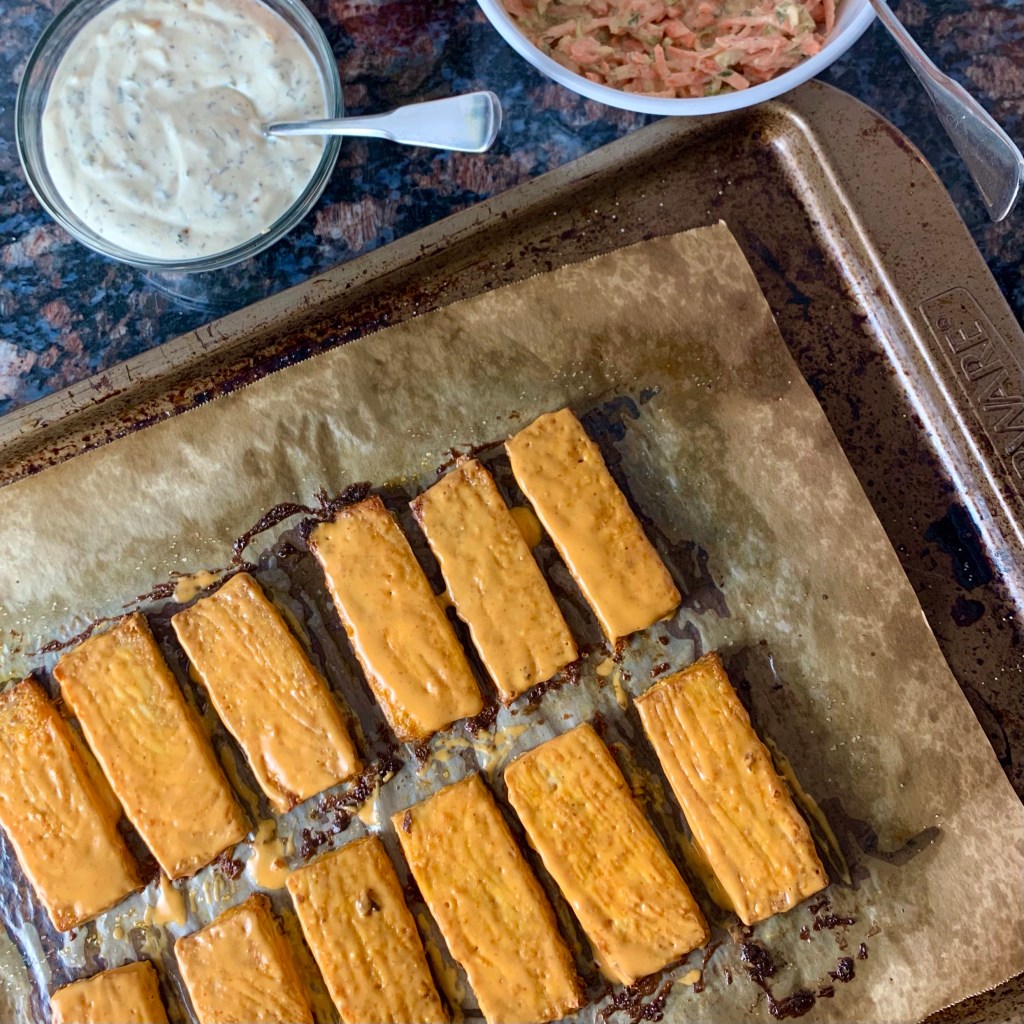 Roast tofu for 20-25 minutes. Remove from oven and flip. Push tofu slabs together and brush the top side with 1/3 of the buffalo sauce. Separate slabs and return to oven for 10-15 minutes.