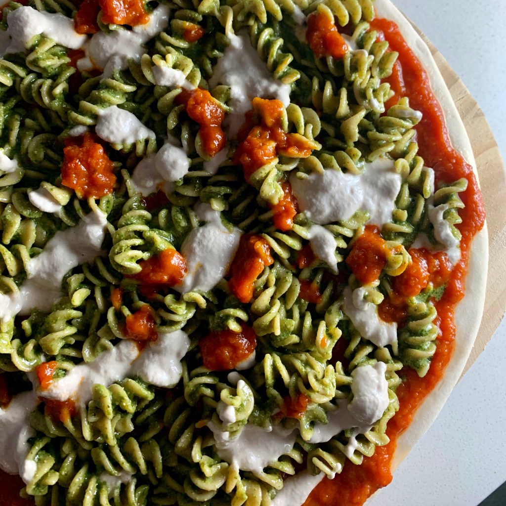 Spread a scant cup of sauce evenly over the dough (reserving some for the top). Now fo the pasta. If dry, add a splash of the pasta-cooking water then add the pesto pasta to the pizza. Top the whole thing off with sunflower or cashew cream dollops as well as some marinara dollops.