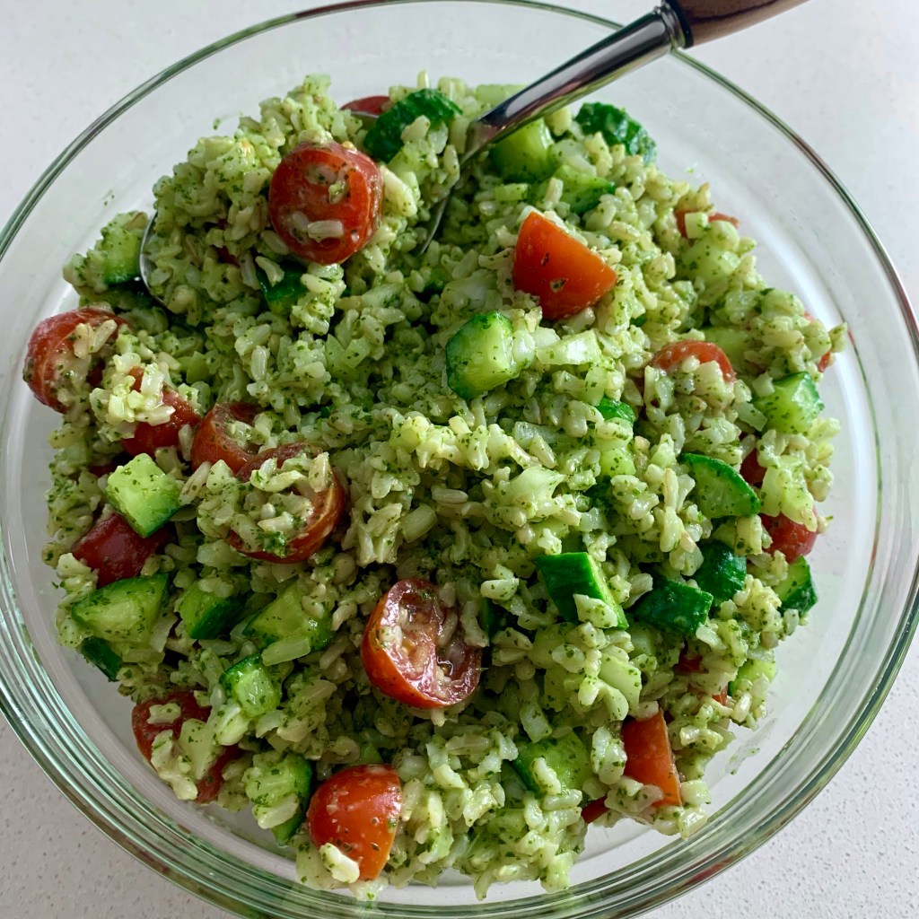 Basically, my version of Tabouli is inspired by the traditional (fresh herbs, tomato, cucumber, onion, lemon, garlic), but with the feel of a true grain salad (hearty brown rice, fresh veggies and a parsley-mint-lemon vinaigrette). My beloved brown rice is chewy, satisfying and a great base for this salad because it perfectly absorbs the vinaigrette. Which brings us to that vinaigrette. By far the star of the show, this vinaigrette combines fresh parsley and mint and with rich olive oil, bright lemon juice and flavorful garlic. I add a touch of sweetness with honey or agave to balance out the lemon, and then just blend it all together. The finely chopped fresh herbs are broken down by the acidic vinaigrette and the flavor goes from overpowering to just right. I then toss the vinaigrette with cooked rice and fresh veggies, and call it a day. All the flavors and health benefits of a traditional tabouli salad, just with a client-approved Food Vibes twist.