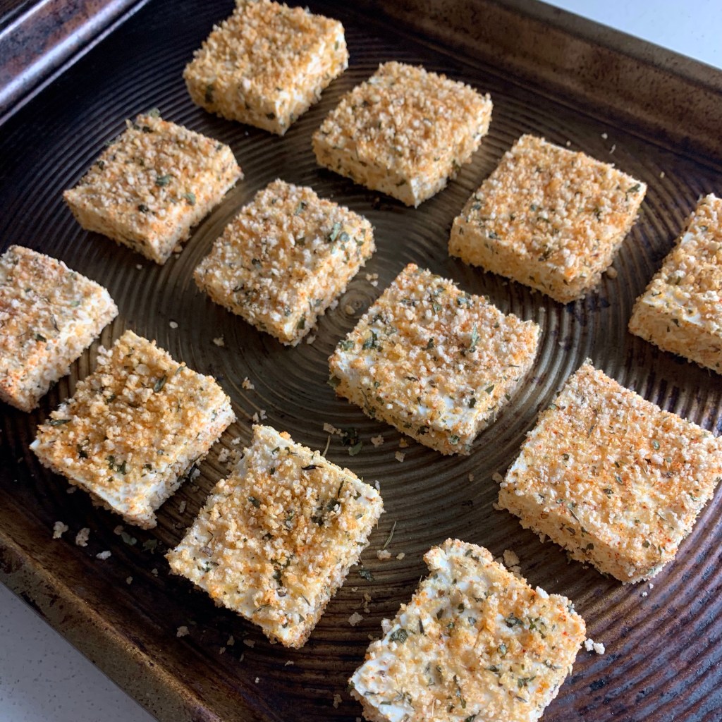 Carefully press the oiled tofu nugget into the bread crumb mixture (they’re delicate), getting all sides, and gently shake off excess. Transfer to a baking sheet. Repeat with remaining nuggets.