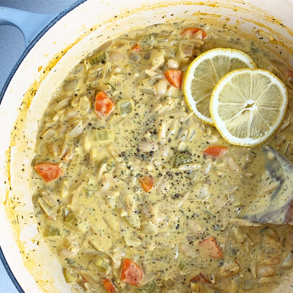 GREEK LEMONY WHITE BEAN & ORZO SOUP (AKA VEGAN AVGOLEMONO)