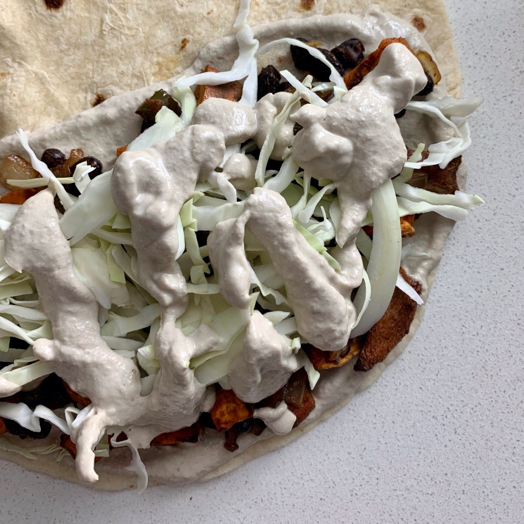 Make the quesadillas in batches of two, prepare quesadillas as they’re ready to cook. Add a scant 1/4 cup of sunflower seed cream to half of each tortilla and spread into an even layer, getting close to the edge. Top evenly with 1/4 of the bean/veggie mixture, then a handful of shredded cabbage. Top cabbage with another 1/4 cup of the sunflower seed cream by drizzling it over the cabbage. Fold the clean half of the tortilla over the toppings.