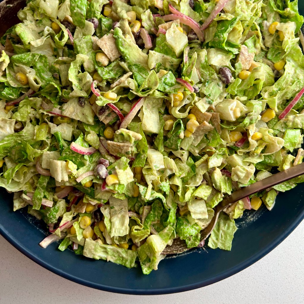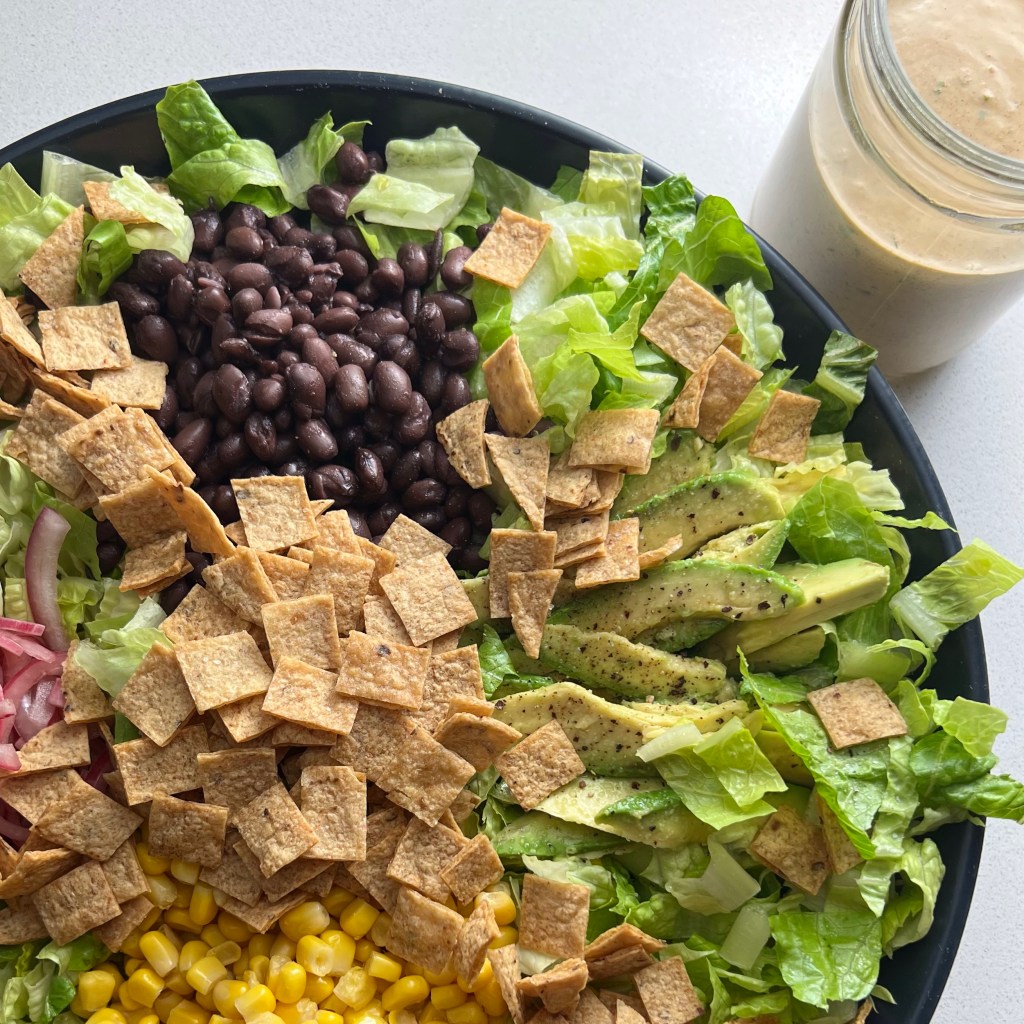 As I was saying, this dressing was created for a salad, a salad packed with romaine, corn tortilla “croutons,” pickled red onions, black beans and corn. But it’s also an amazing dip for crudités (talk about an easy snack or side dish to have on hand), or as a sauce inside of a veggie-filled wrap. Or on tacos. Or as a dip for tofu nuggets. Point is, this sauce…the dressing… it’s freaking delicious.