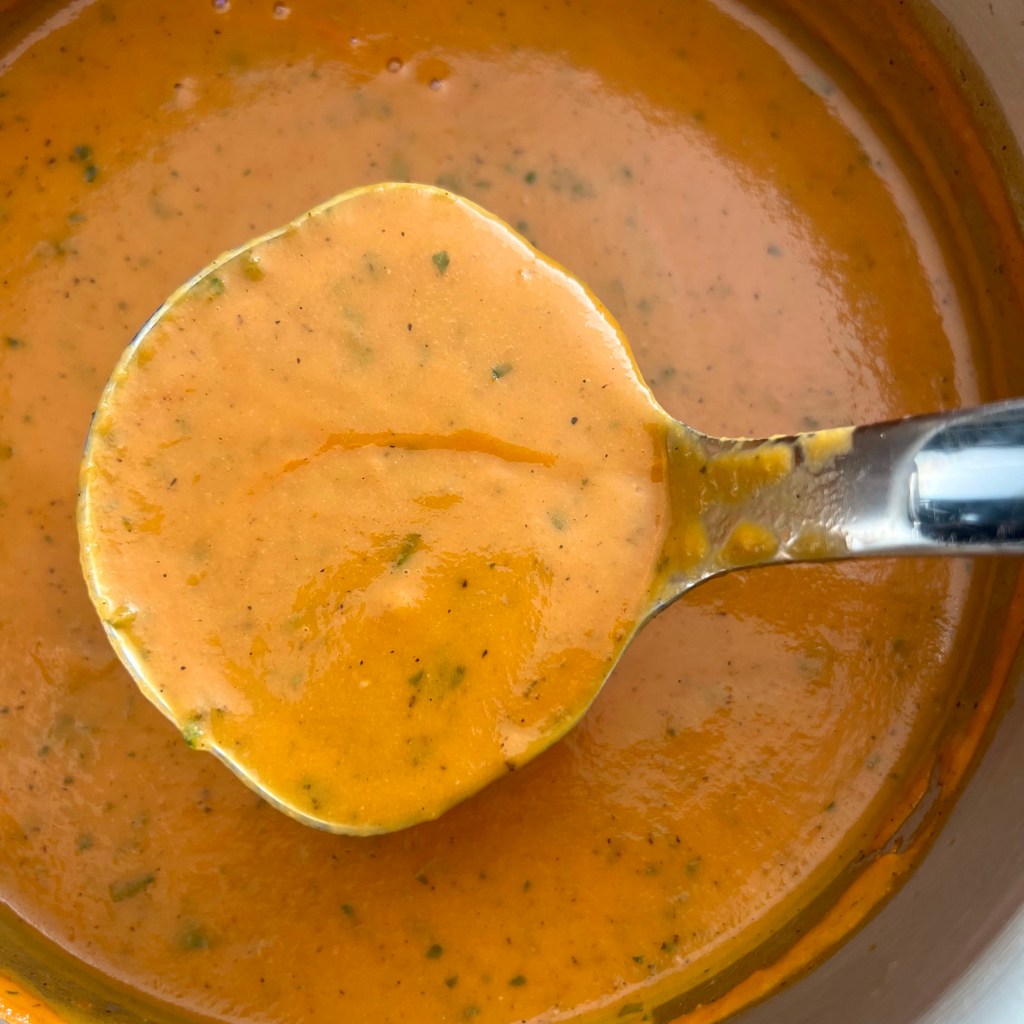 If using fresh basil, roughly chop the leaves and blend/pulse using the immersion blender until the basil leaves are just finely chopped up (WARNING if you go too far the color of the soup will turn brown instead of red with green flecks).
