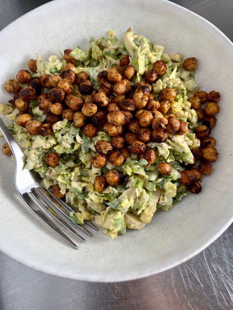 I make the creamy, dreamy dressing for this salad using sunflower seeds, a staple in my pantry. Toss the dressing with sliced brussel sprouts and top with simply seasoned chickpeas, roasted until crispy.