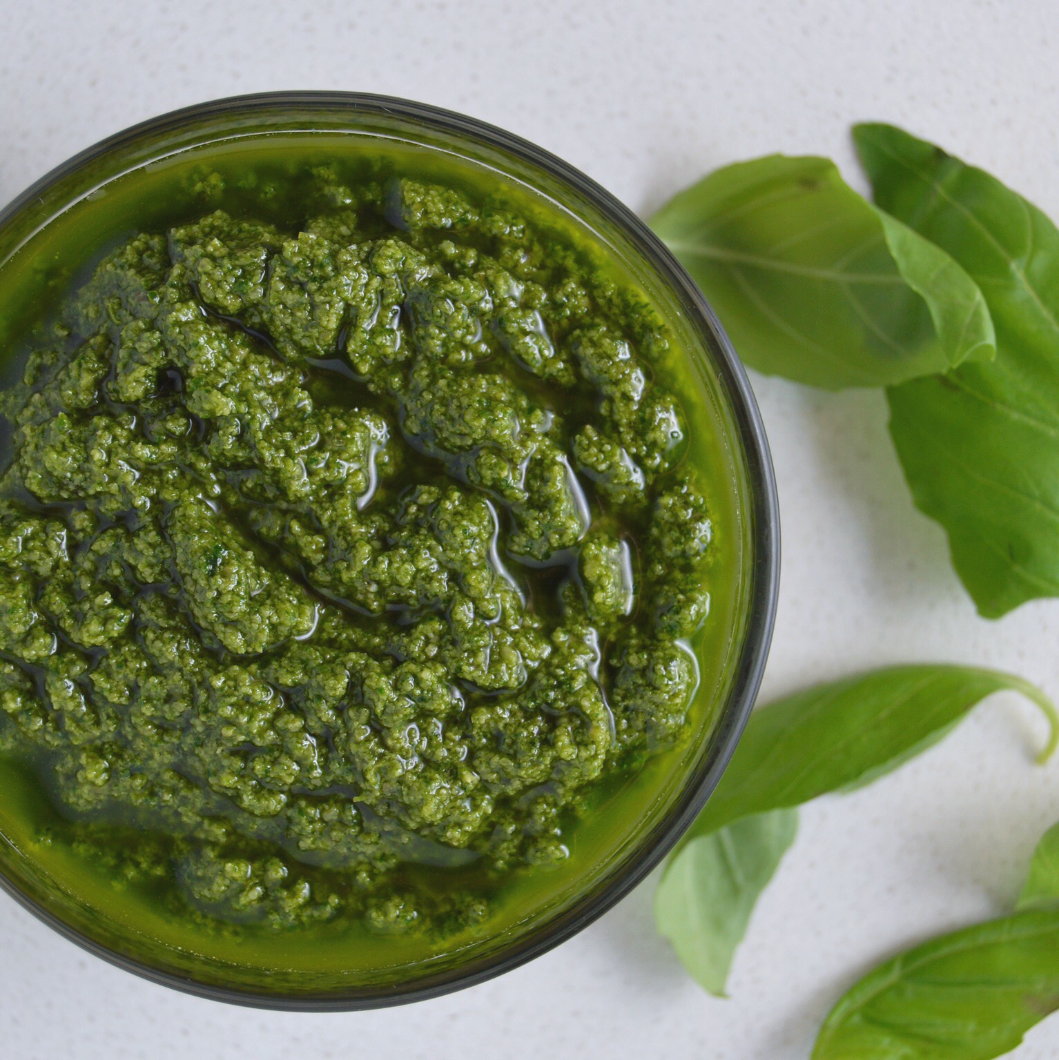 My pesto is made with toasted pumpkin seeds and a blend of basil and spinach which means it’s less expensive (pinenuts are crazy pricey and using all basil really adds up). Plus, pumpkin seeds are a pantry staple of mine so I always have them ready to go. I generally have a basil plant and baby spinach in the fridge so I make this pesto A LOT on a whim and use it in some of my favorite pasta and soup recipes – it’s super versatile.