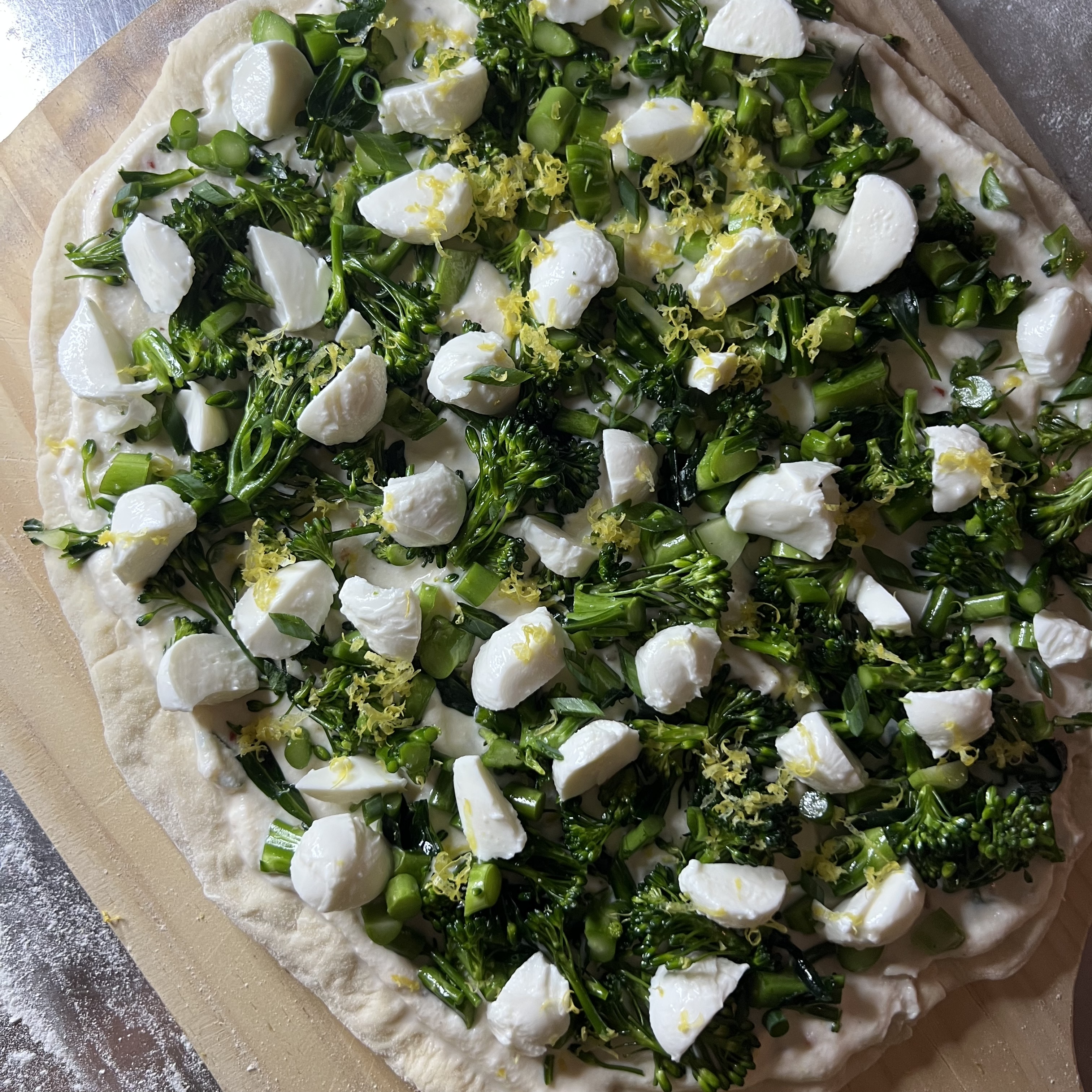 To make each pizza, spread on 1/2 of the ricotta mixture, getting it almost all the way to the edge, leaving a small crust ring. Sprinkle ricotta with 1/2 of the broccolini. Top evenly with half of the mozzarella, and half of the reserved lemon zest and green onions. Bake for about 10 minutes, or until crust and bottom of the crust is light brown. Repeat with second dough.