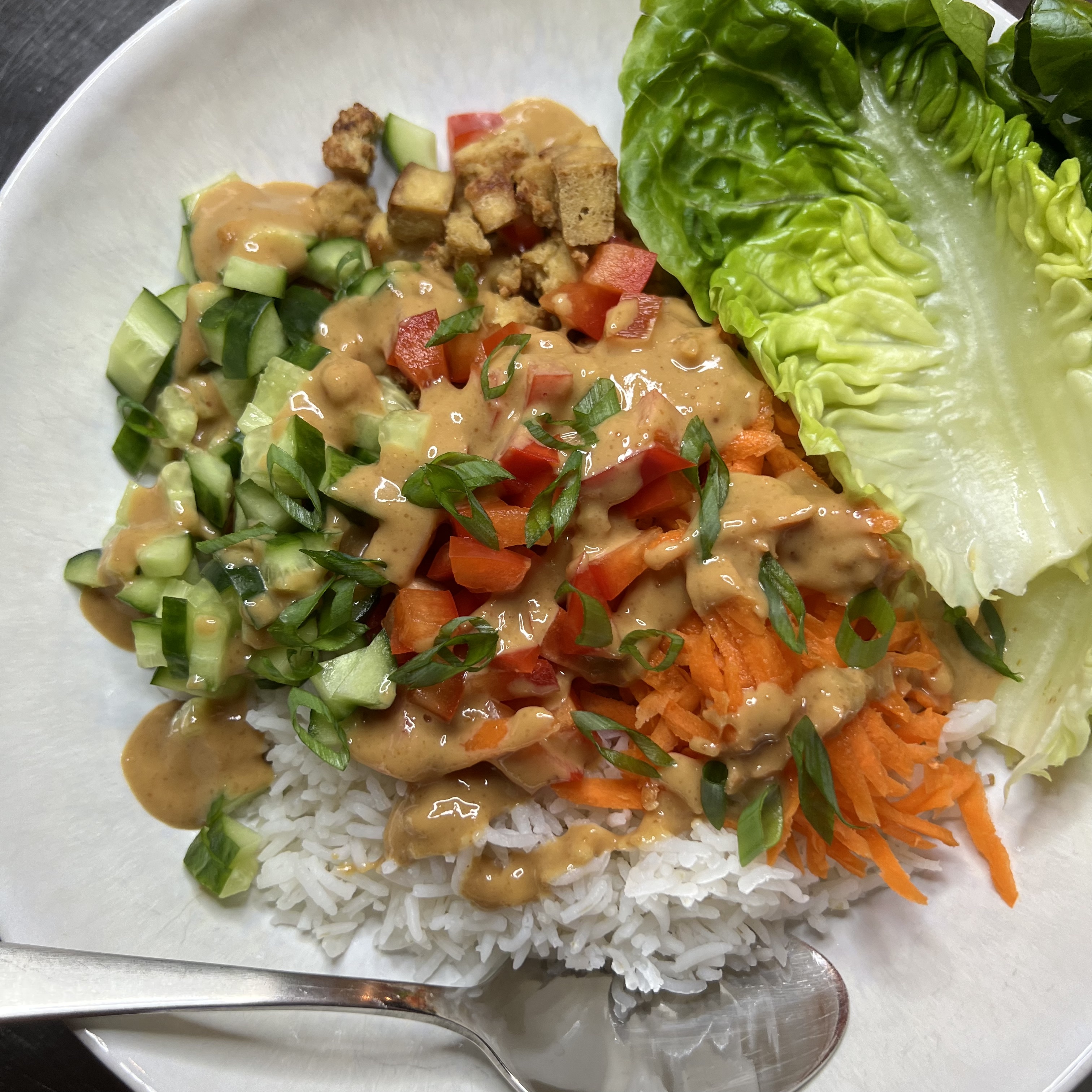 All the flavors of an Asian-inspired lettuce wrap spread but in grain bowl form. I use roasted tofu, sweet-and-savory peanut sauce and lots of fresh veggies for a bowl of plant-powered goodness you’ll be sure to crave.