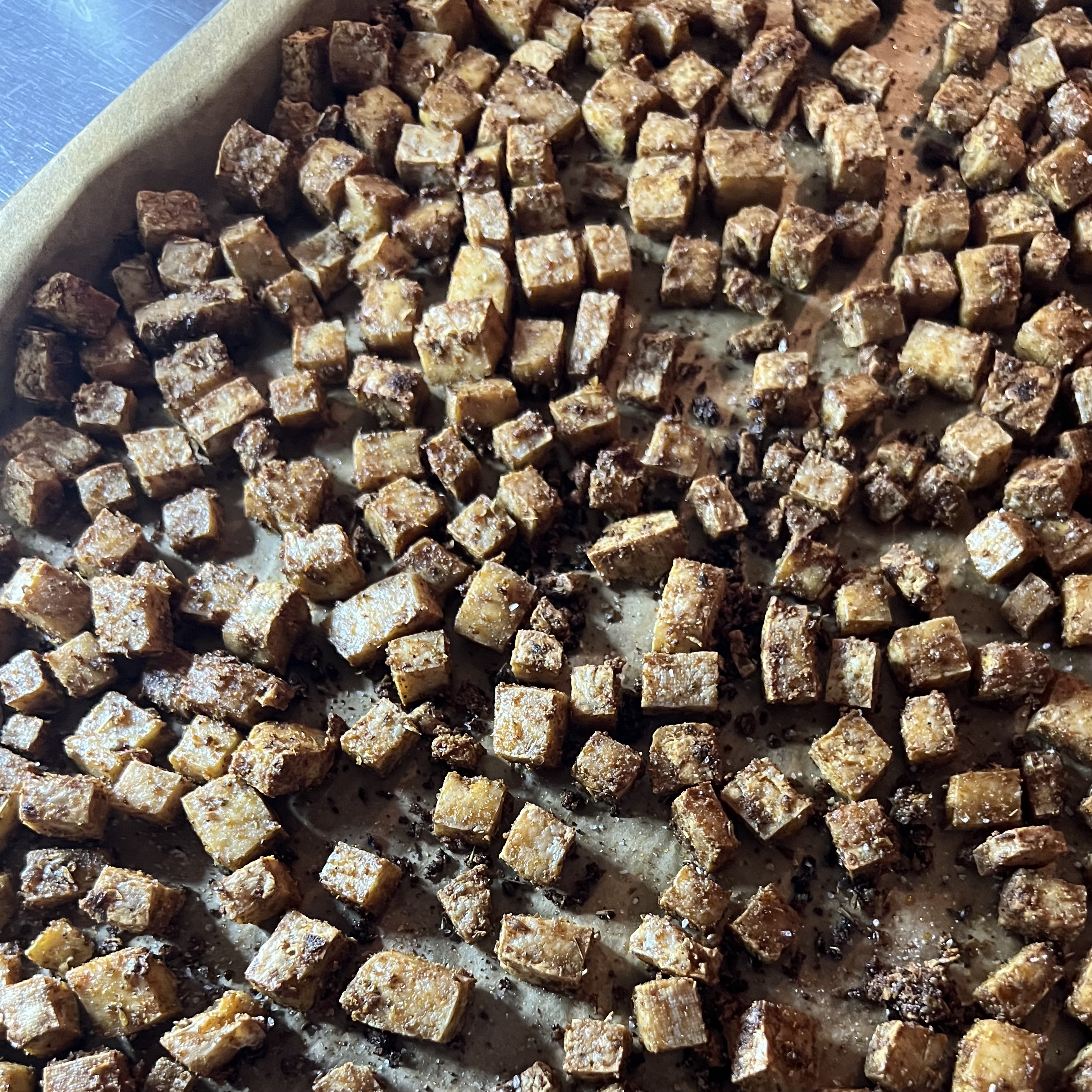 Preheat oven to 425 degrees (F). Cut the tofu (pressed if needed, see notes) into small cubes, it’s ok if it crumbles. In a large mixing bowl, combine remaining tofu ingredients, plus 1.5 teaspoons salt. Stir to incorporate with oil. Add tofu, toss to fully coat. Transfer to a large parchment lined baking sheet. Roast for 25 minutes. Toss and rearrange. Continue cooking for another 20-25 minutes, until crispy and chewy.