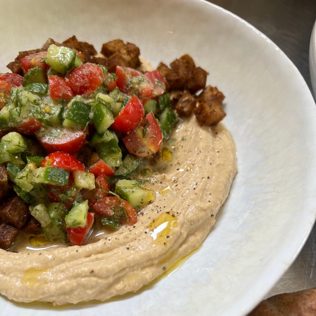 Forget hummus as an appetizer or a sauce accompanying a meal, make hummus the main event. It’s so fun to experiment with different hummus bowl combinations – from the flavor of the hummus itself, to the toppings. I love this classic-style hummus topped with crispy, chewy tofu and a fresh salad of cucumber and tomato.