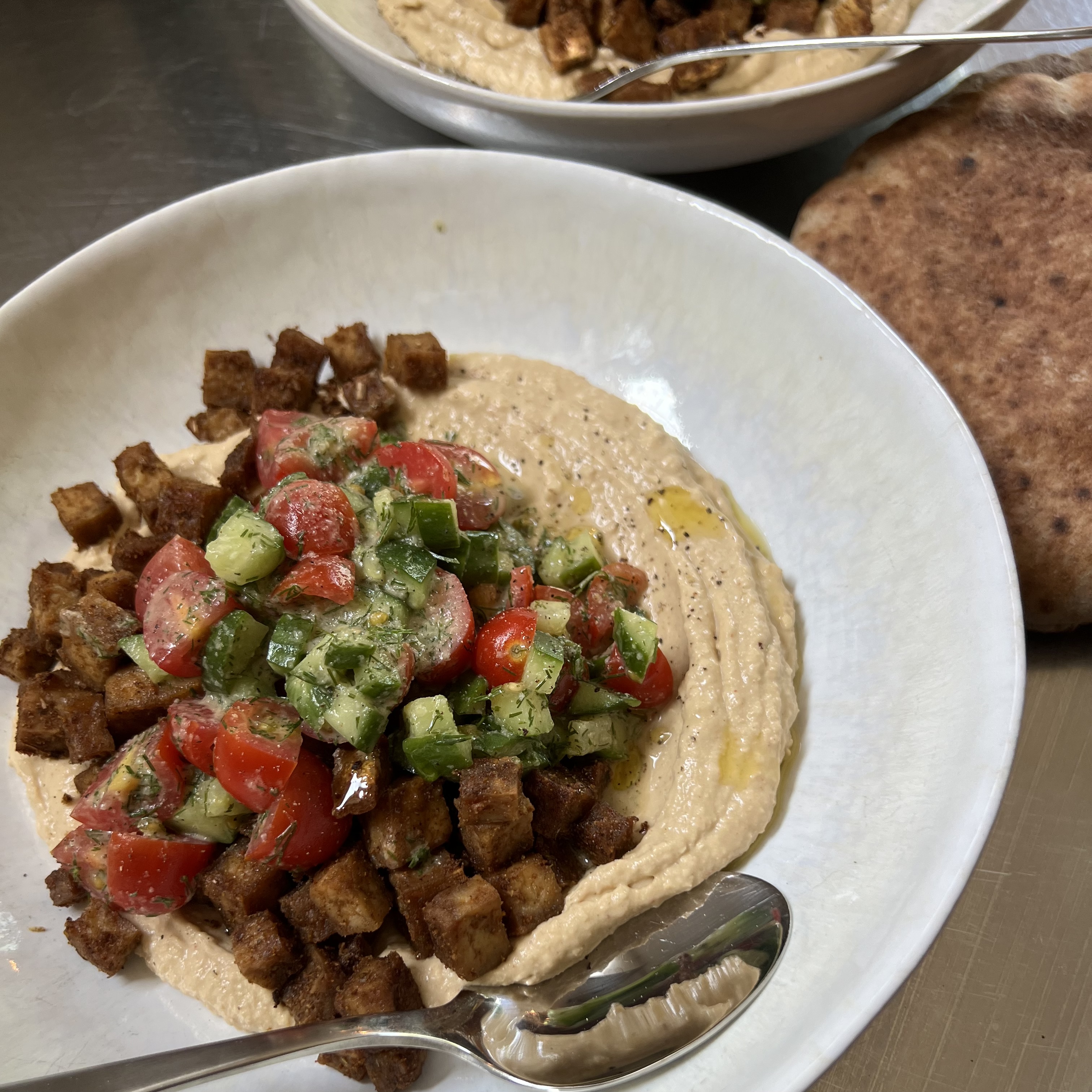 I’m on a hummus bowls kick and this is pretty much as classic as it gets. My most basic hummus recipe topped with crispy, chewy tofu and fresh Mediterranean salad.