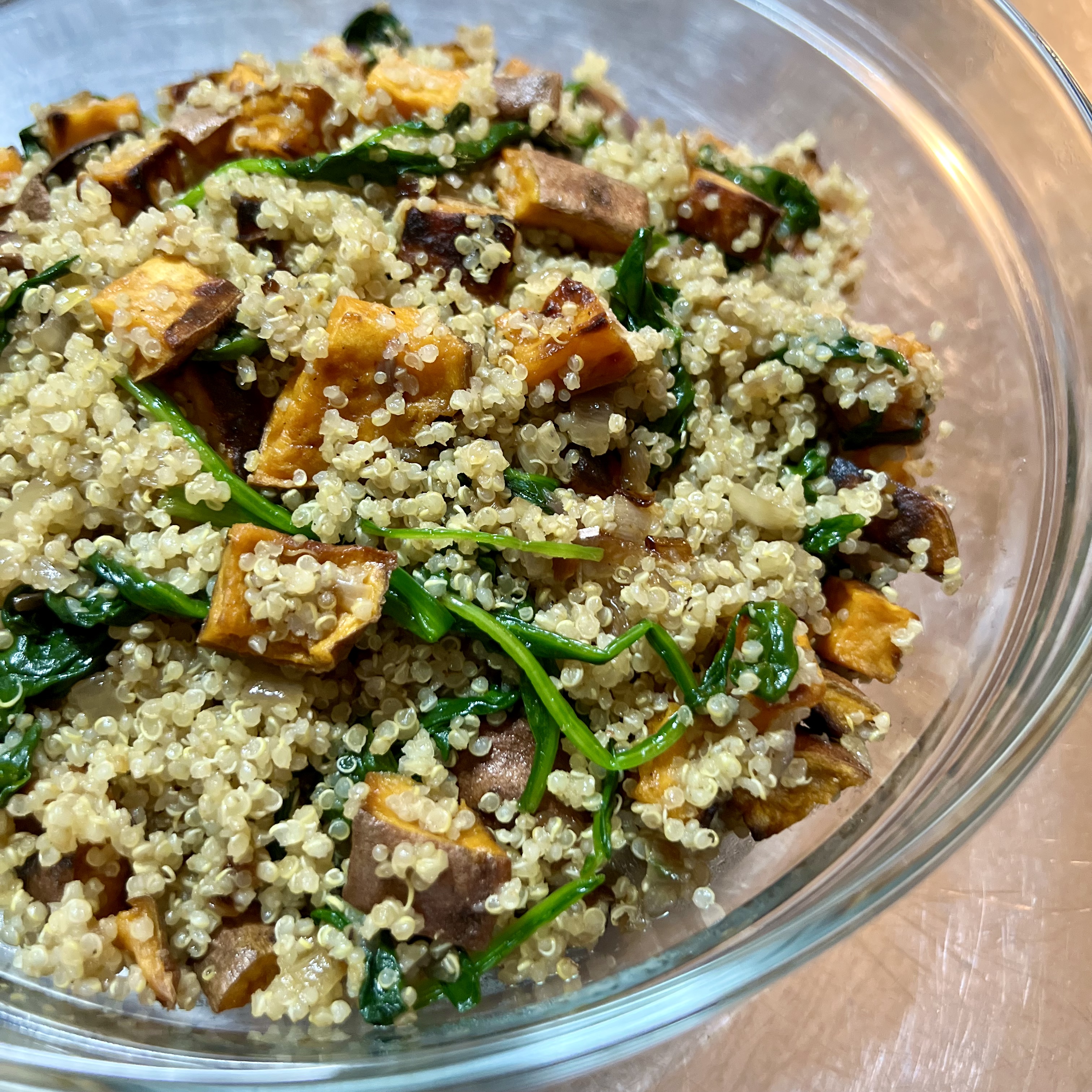 In a large skillet, heat 1/4 cup olive oil over medium heat. Add the chopped shallots and 1/2 teaspoon salt. Saute for 8 minutes until soft, translucent and browned. Remove from heat and add spinach, carefully toss until wilted. Transfer immediately to quinoa bowl. Mix well. Add sweet potatoes when they are finished roasting and slightly cooled. Season with 1/2 teaspoon salt and 1/2 teaspoon black pepper.