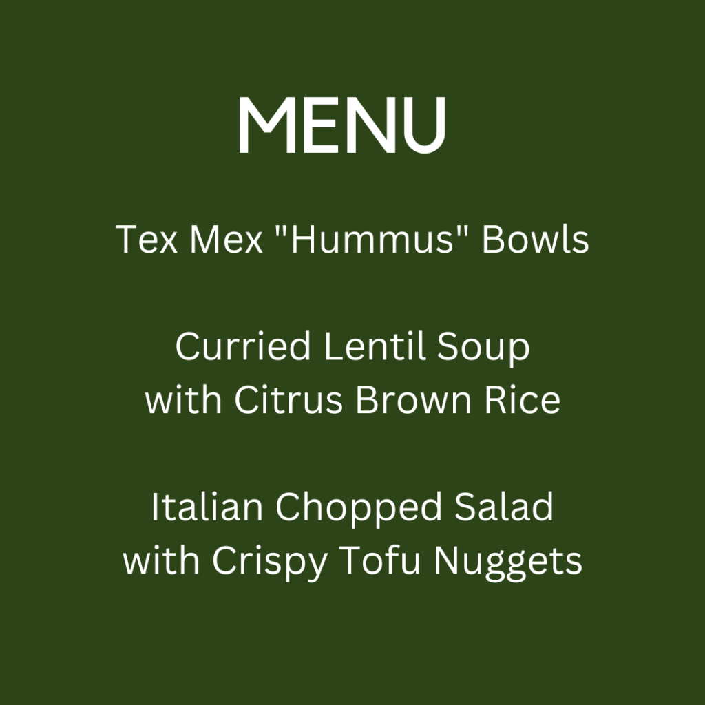 My weekly meal plans are designed to make cooking plant-based food easy and delicious. I curate three recipes each week, all based on my pantry and fridge stock list.