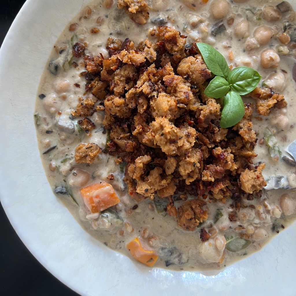 Blend Cashews with 1 cup water until super smooth. Stir into soup. Allow to sit for 30 minutes to thicken and for flavors to merry. Top with sausage, if using, and garnish with fresh herbs.
