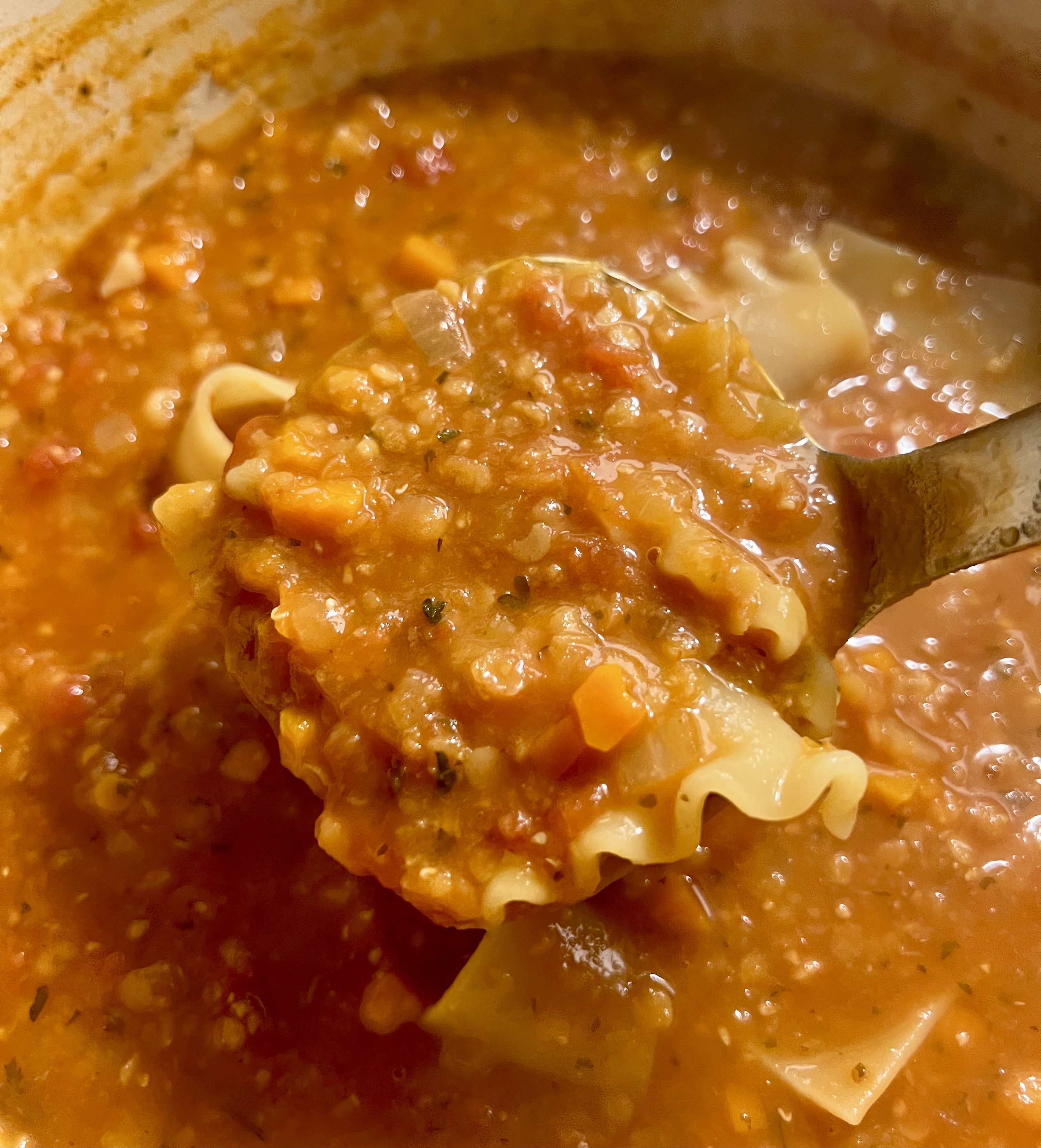 This easy soup has been on my mind after seeing it all over my social feeds and I finally gave it a try, with a twist of course. The typical versions almost all include meat, but I, instead, used pre-cooked red lentils for protein, fiber and a meaty texture. To make this soup as convenient as possible for myself, I stuck to my Lean Pantry stock list when I could, including with the spice rack items (but if you keep italian seasoning stocked, or dried basil, go for it).