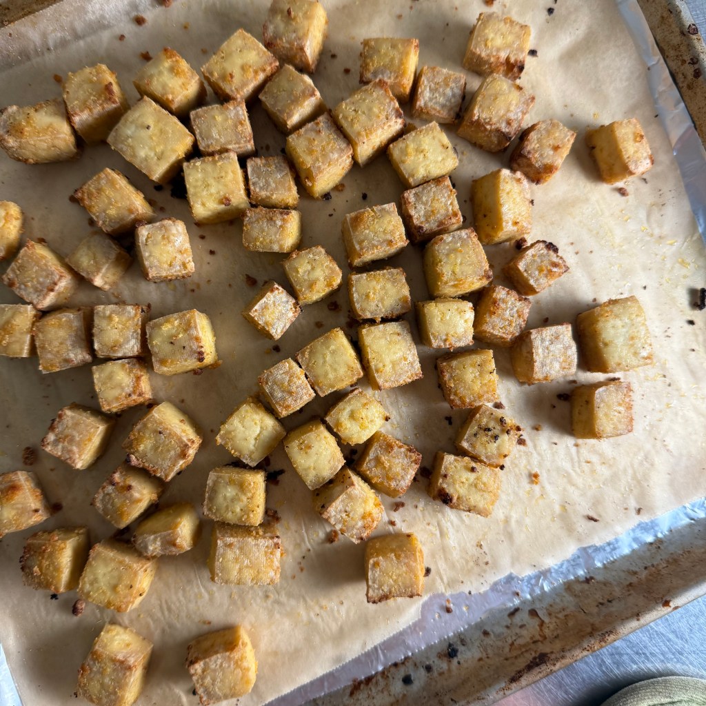 For the tofu, mix oil with salt, cornstarch and spices in a mixing bowl. Add tofu cubes and toss. Transfer to a parchment lined baking sheet. Roast in the airfryer at 375/400 for 25 minutes, give or take, until crispy. Toss once during cooking. Or use a conventional oven preheated to 425. Same method, just takes longer, 40 minutes give or take.