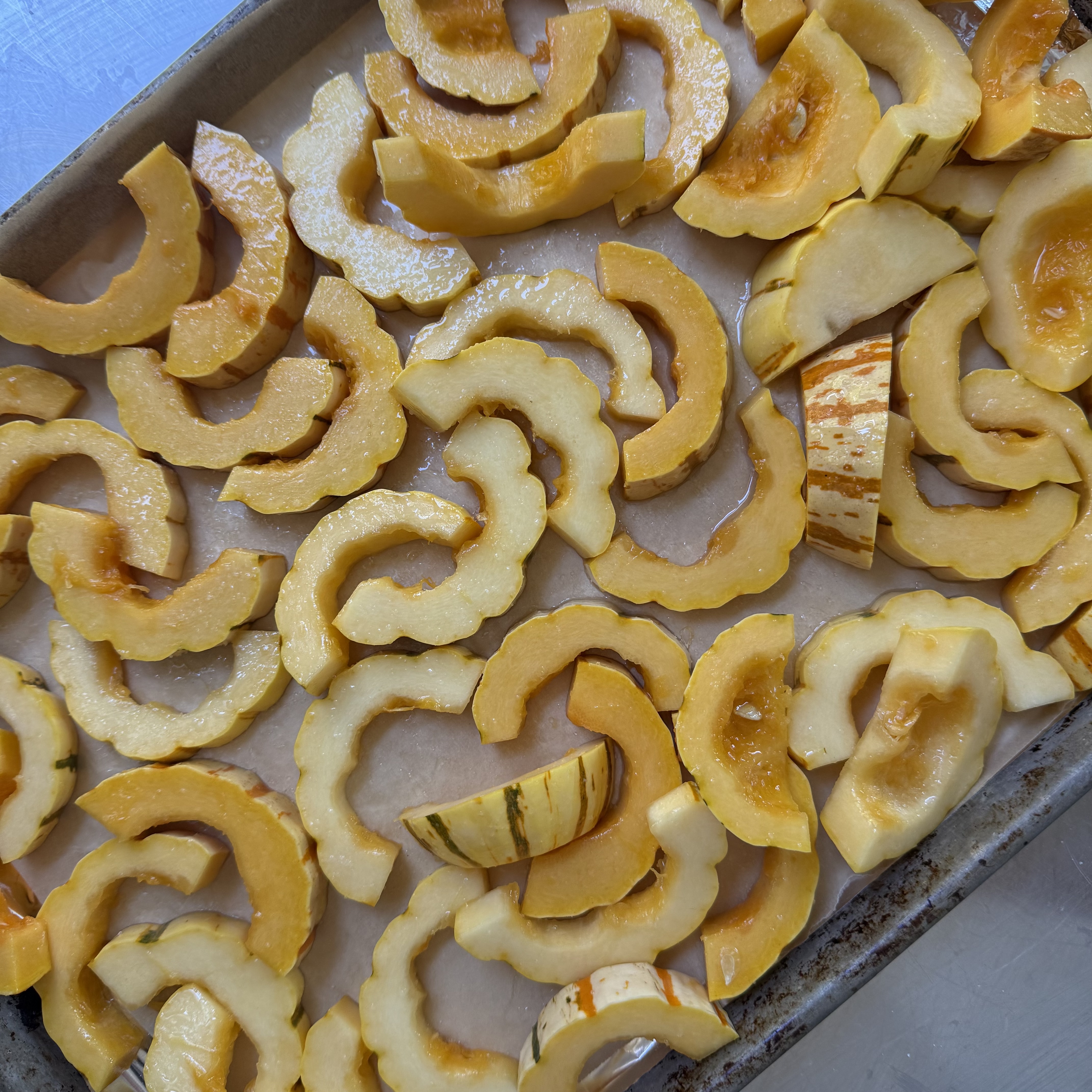 I like cooking with delicata squash because it doesn’t need to be peeled and it’s easy to cut up, unlike some large squash options. I cut them length-wise, scoop out the seeds and slice into 1/2-1/2″ half circles.