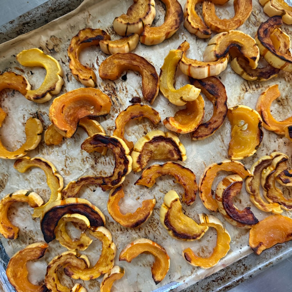3 delicata squash, halved/seeded/sliced, roasted with oil and salt (425 degrees, 35-40 min or until edges are golden, toss 3 times during cooking)