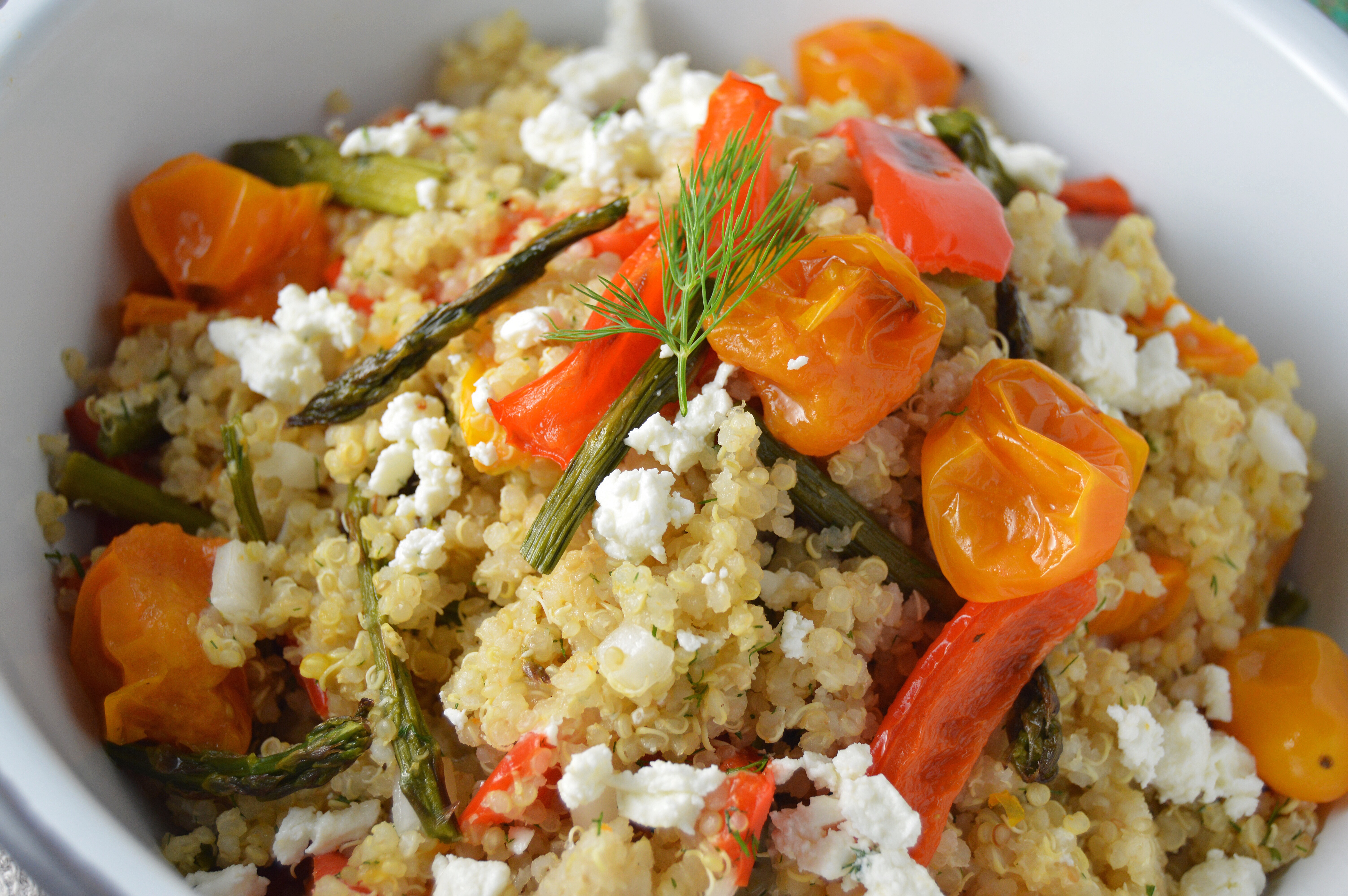The ingredients in this particular quinoa salad are simple but come together perfectly to create a symphony of flavor and texture. Roasted tomatoes, bell pepper and asparagus give this salad richness and depth of flavor. And all three pair perfectly with one of my all time favorite ingredients – creamy, tangy goat cheese. Finally, white onion, chopped dill and lemon juice add freshness and zip. The ingredient list is short but thoughtful, making this salad quick, simple, nourishing and absolutely delicious.